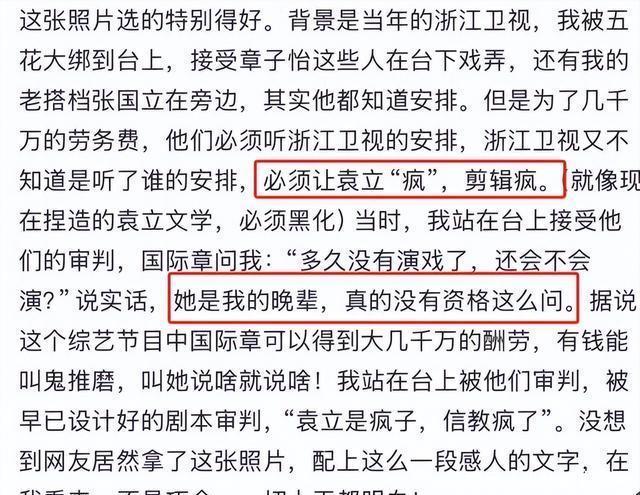 袁立特别指出,作为晚辈的章子怡根本没资格问她"多久没演戏", 而两人之所以这么做,是因为节目开出了"大几千万"的天价片酬。